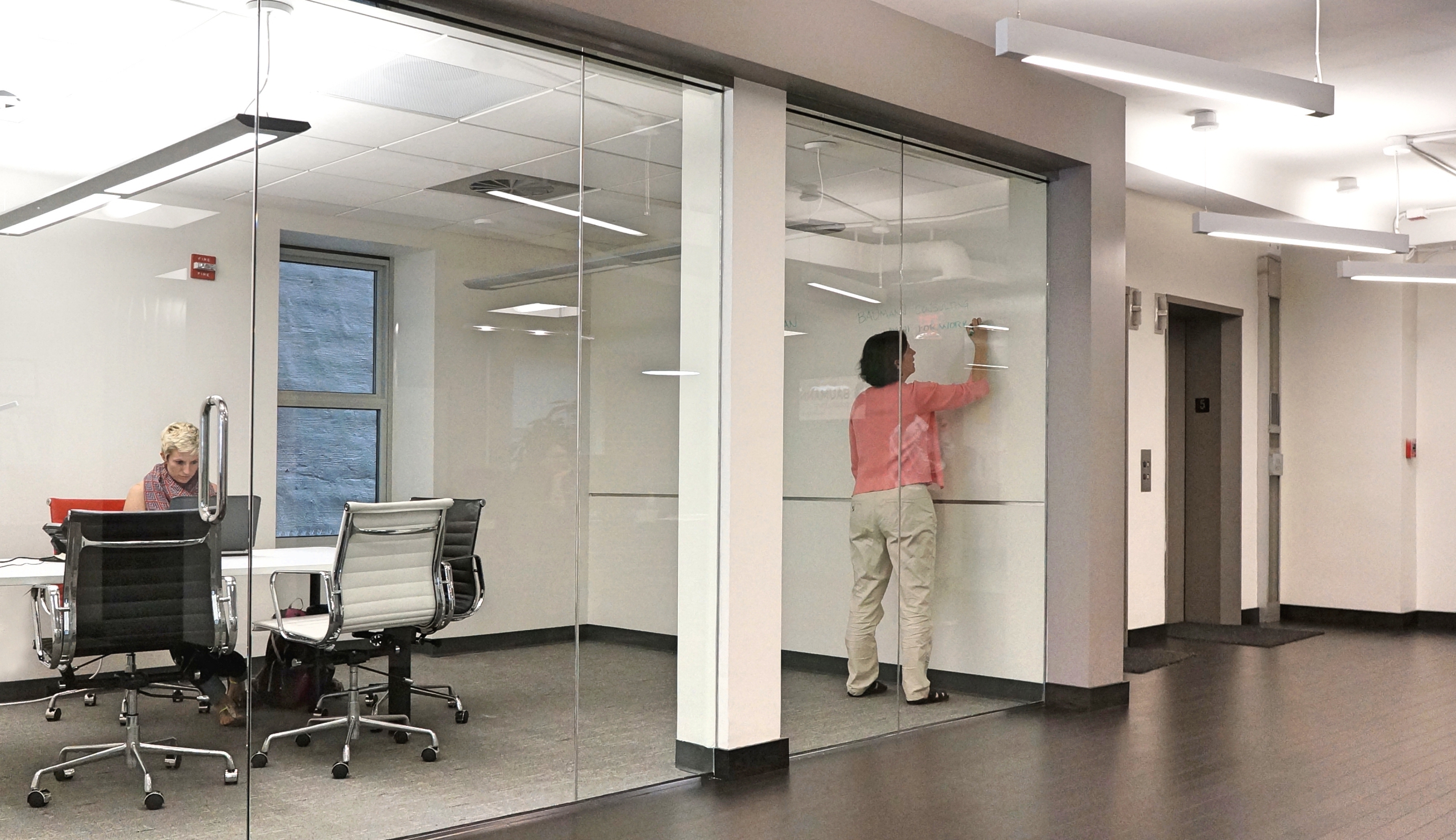 The 5,400 sf interior renovation included two large open floor plan work areas, a large glass fronted conference room, three meeting rooms along with a work room and pantry/dining area. The two existing toilet rooms were renovated with ultra-low flush toilets and a third, accessible toilet room with shower was added. We reused resin panels from the previous build out to create a bike storage area, with a sliding barn door, and reused glazing for the fronts of two meeting rooms and the conference room. A Lutron lighting control system adjusts the new LED fixtures as the daylighting changes throughout the day.
