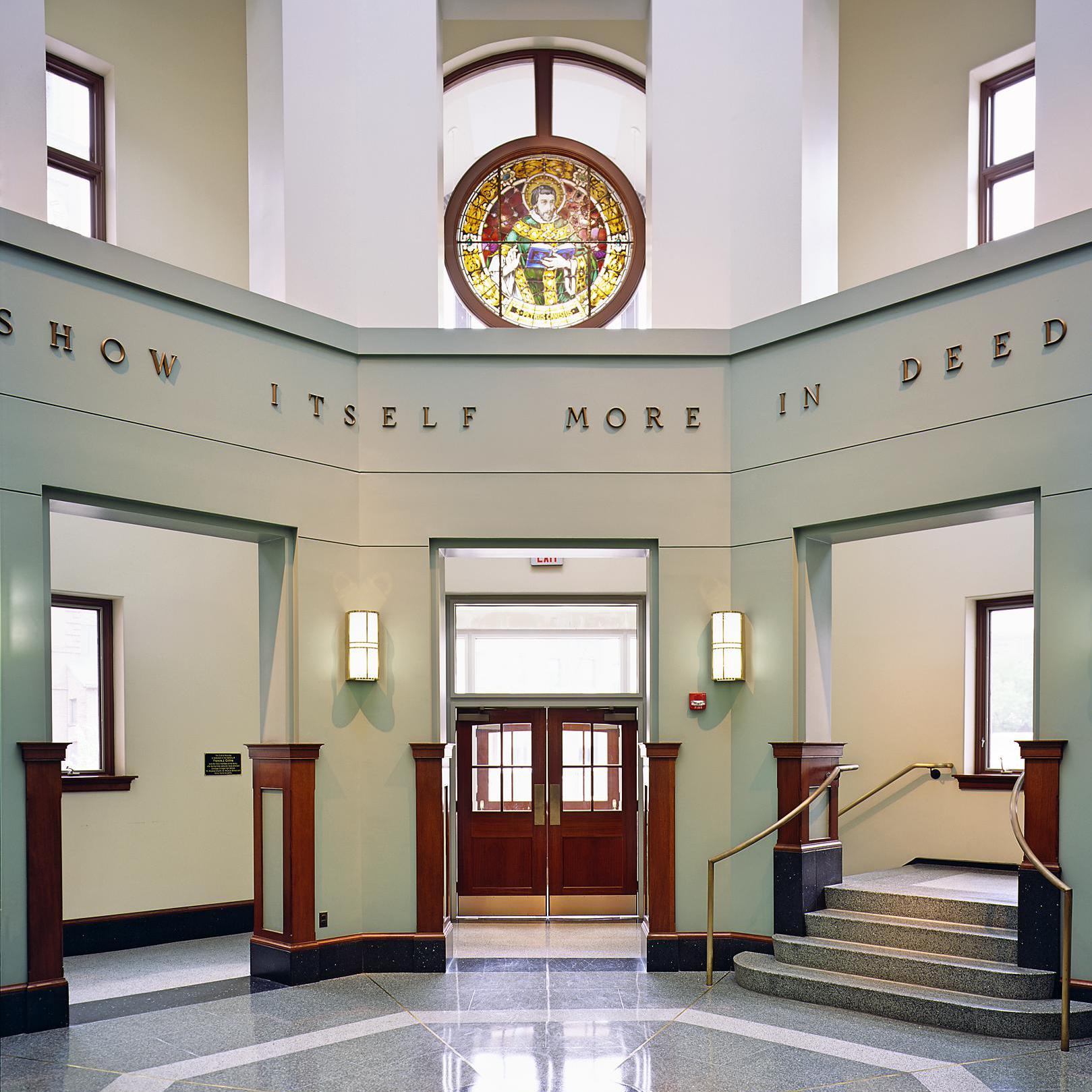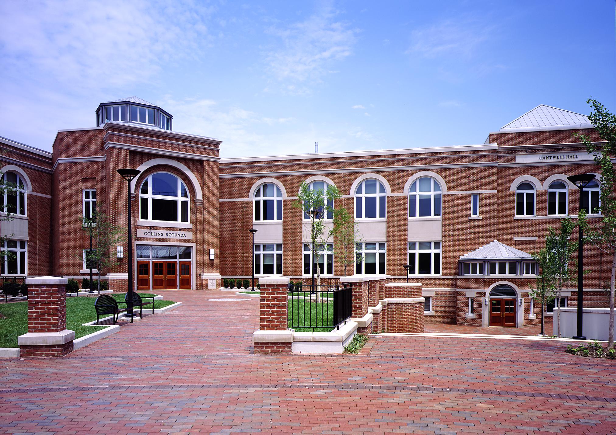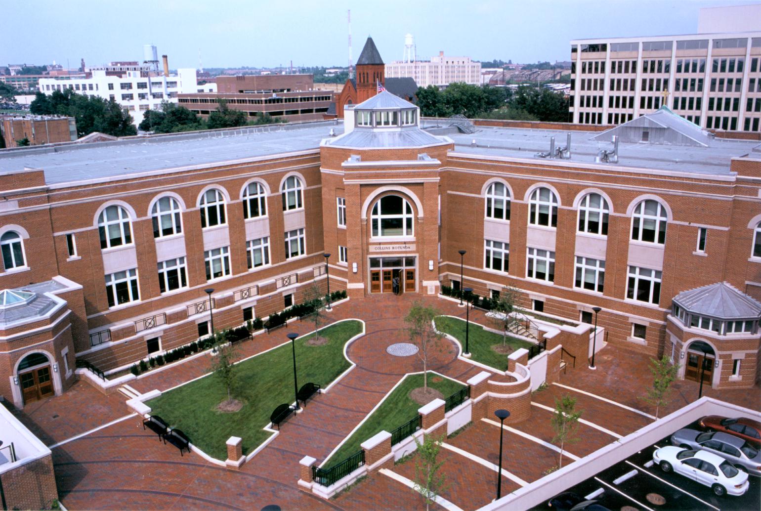 The initial phase of the campus update renovated two historic buildings that years ago had been acquired by Gonzaga: the 1903 Cantwell Hall (a former grade school), and the former Notre Dame Academy for Girls (now Ruesch Hall). These buildings, with their main facades and street entrances fronting K Street NW and North Capital Street, had their backs turned to the Gonzaga campus on Eye Street. Back doors were used as cramped inlets with student foot traffic traversing an urban alley and in-between the cars of parking lot.