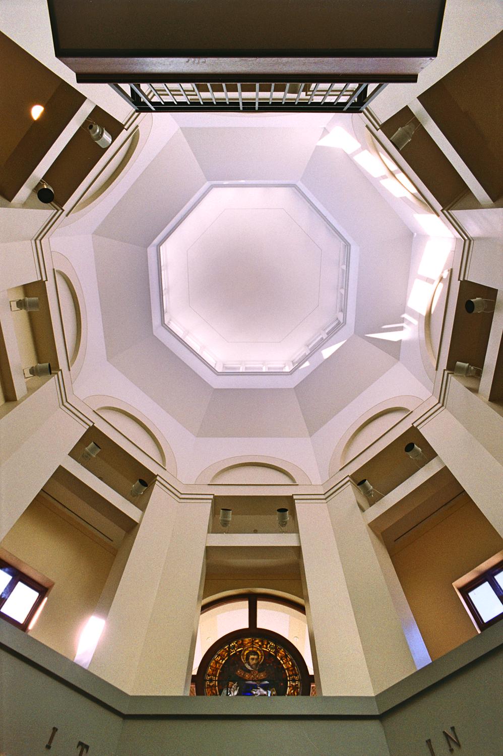 To resolve these issues, a plan for the emerging campus was developed and centered on a new quadrangle to replace the parking lot. The rear facades of Cantwell and Ruesch were transformed and a new central rotunda was added to create a formal entrance at the intersection of the two former school buildings. Designed as a space within a space, it serves as entry, student gathering, orientation, and the occasional reception for visitors. To further ease the flow of students between classes, two smaller entrance pavilions were added at the end of each hall.