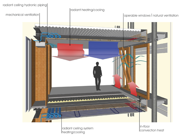 Primary project goals for the renovation were the removal of hazardous materials, upgrades for life-safety and security, and integration of high-performance building systems for heating, cooling and lighting while respecting the original exterior and interior design of this mid-century icon. Sustainable design features include a grey water system, radiant heating and cooling, a central plant with cogeneration, photovoltaic panels, and LED lighting throughout.